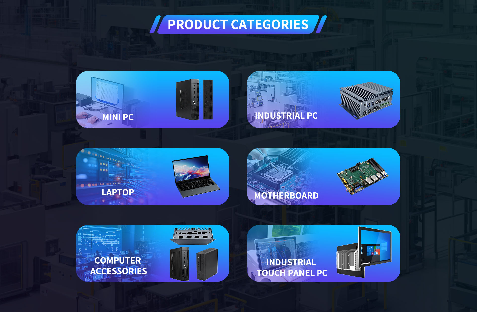 Productos principales:Mini PC, PC industrial, de panel táctil PC, accesorios de computadora, computadora portátil